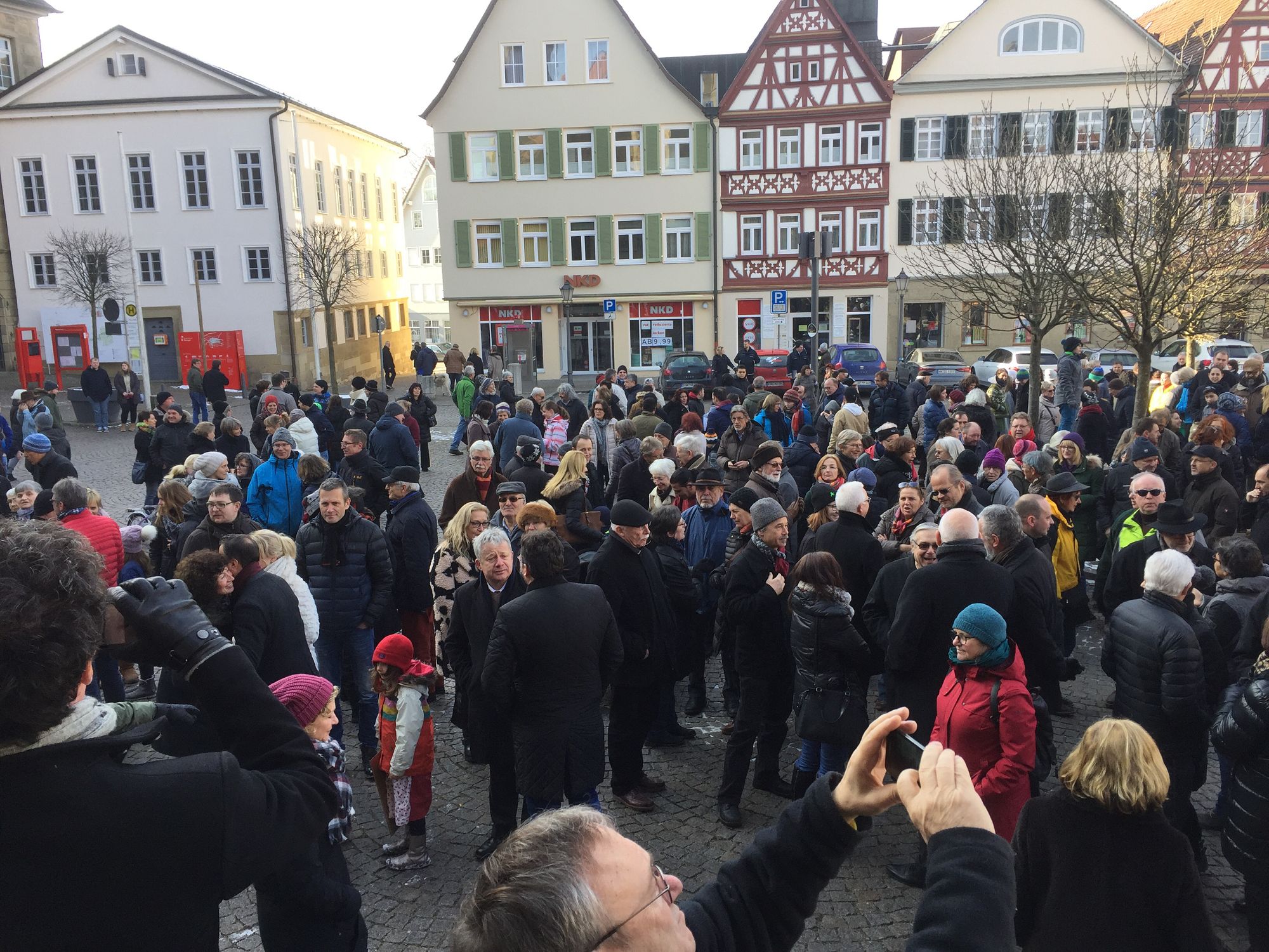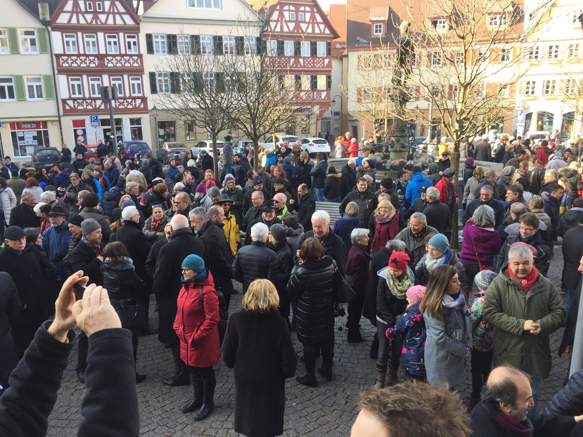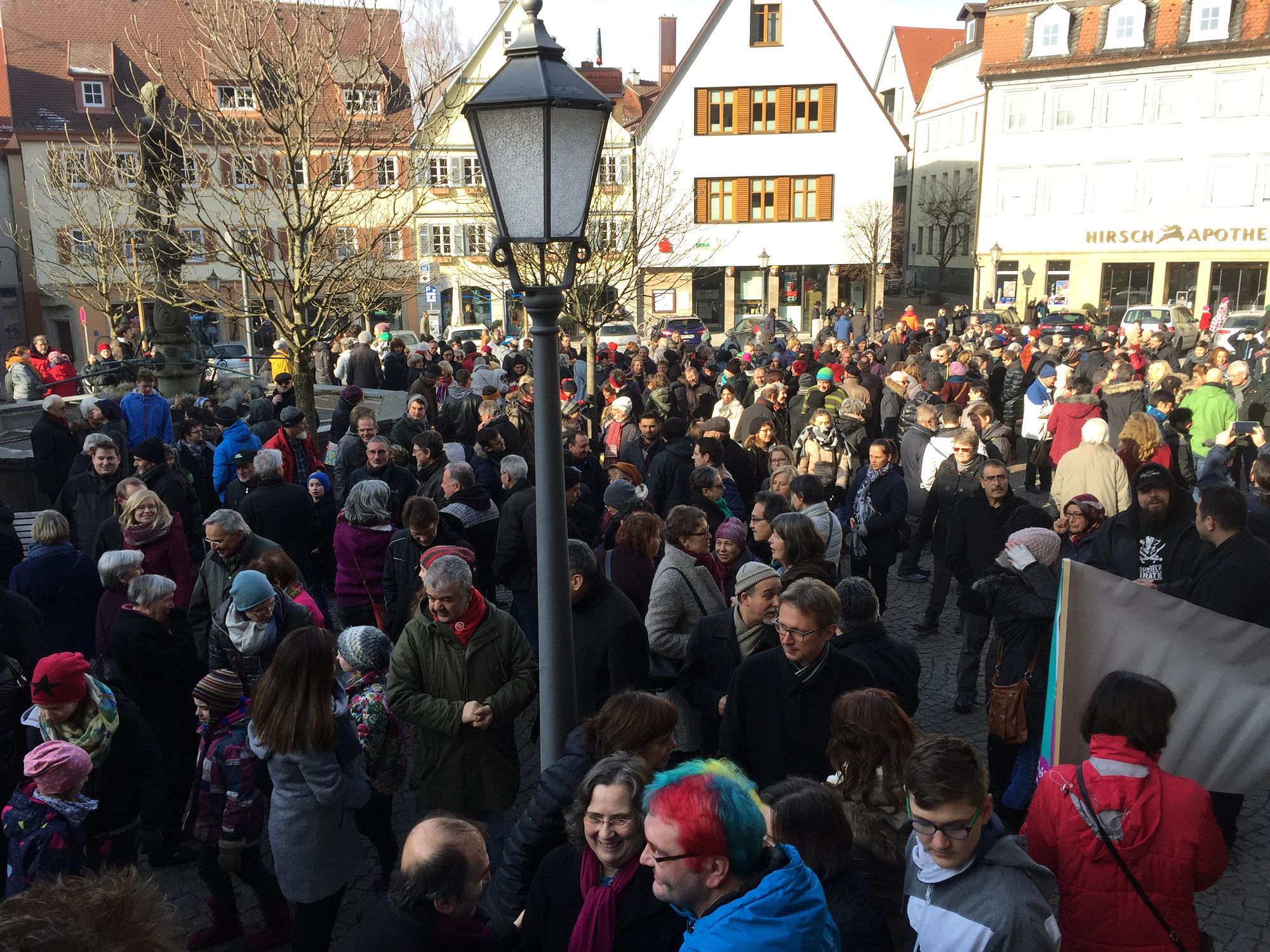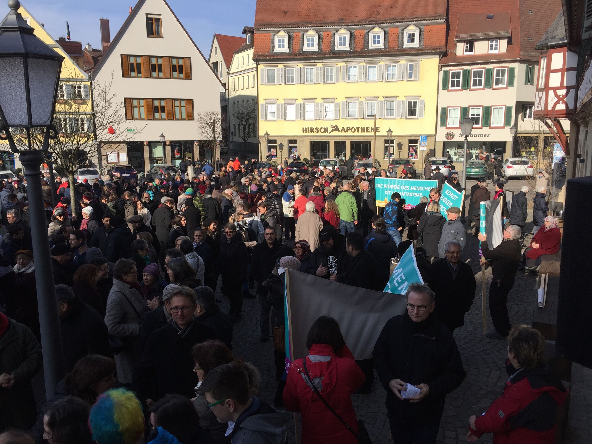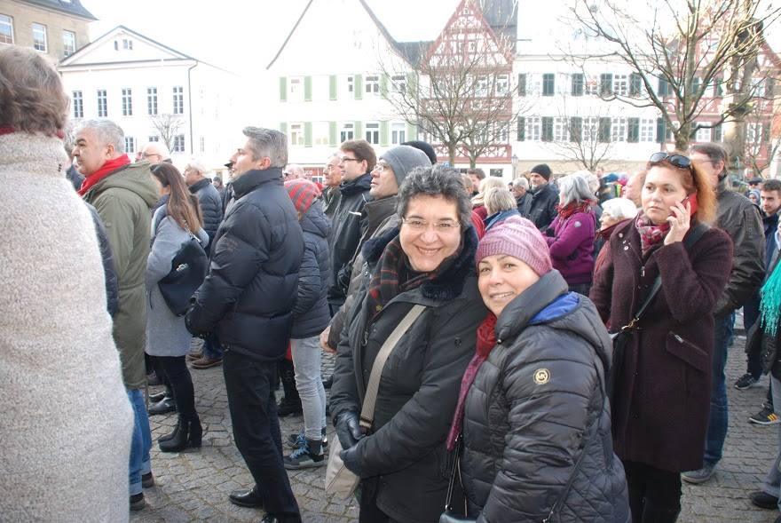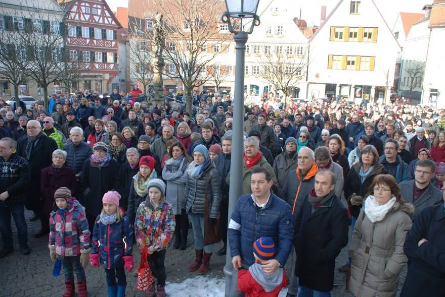 Nach einem Aufruf des Bündnisses „Öhringen ist bunt“, fand am 29.01.2017 eine Kundgebung am Marktplatz in Öhringen statt. Rund 1000 Menschen haben gemeinsam gegen Hass und Rassismus und für ein friedliches Miteinander, Weltoffenheit und Demokratie demonstriert.